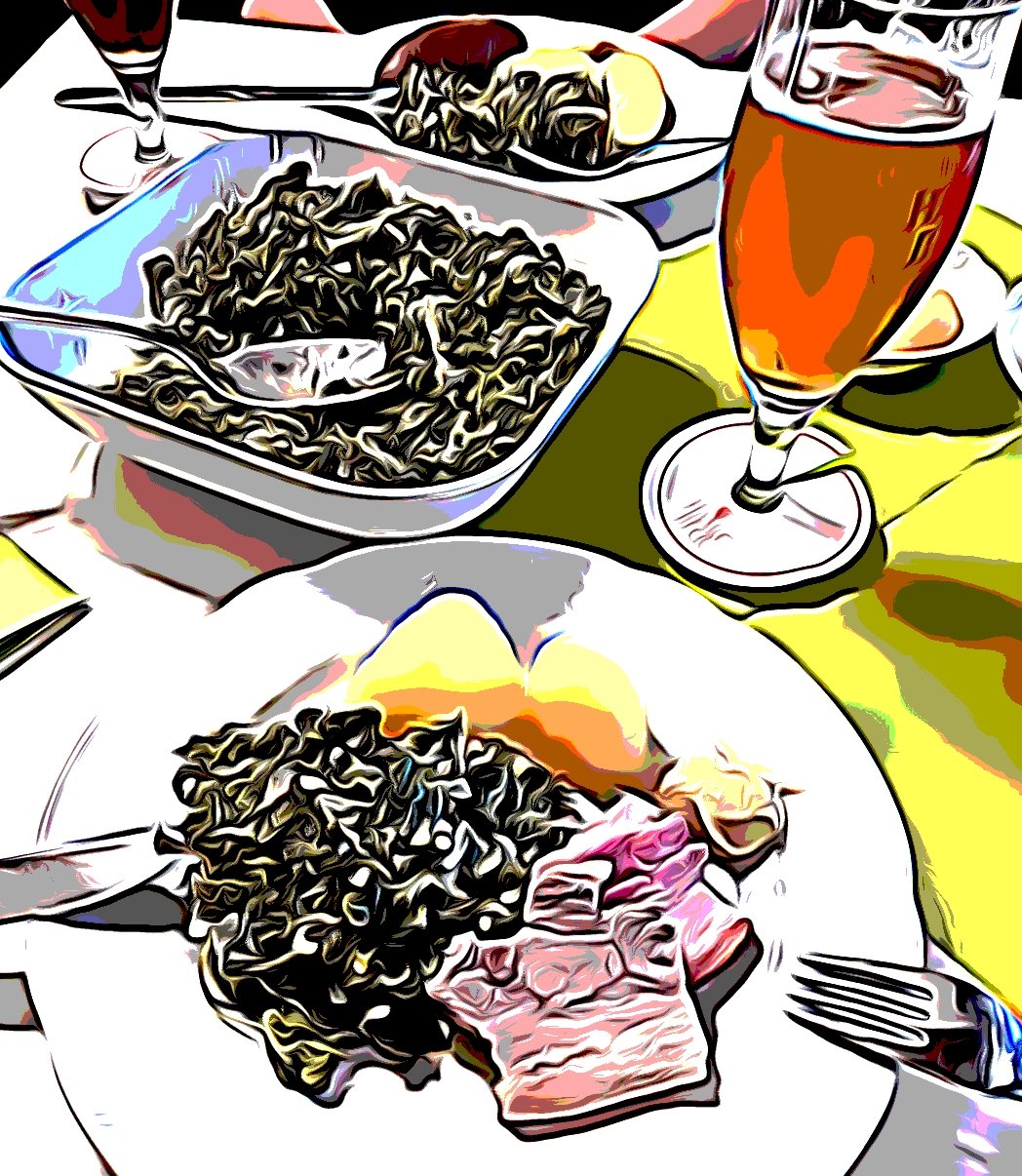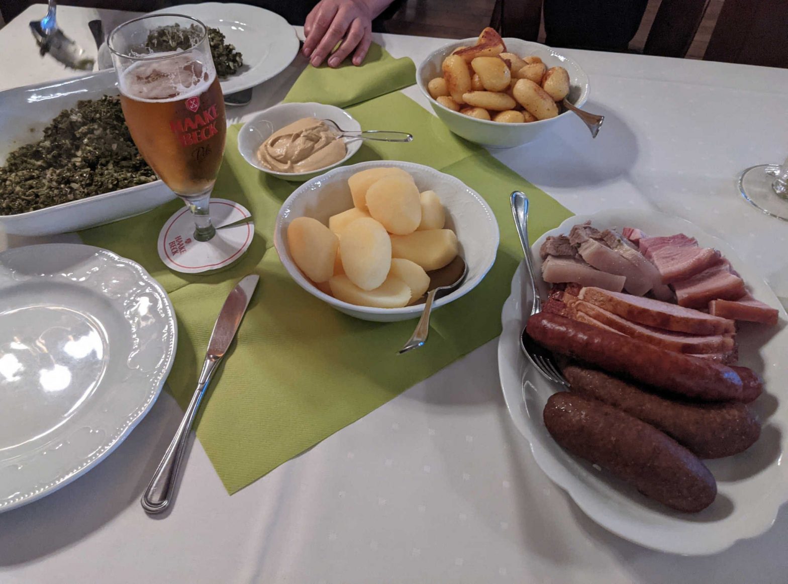 … Niedersächsische Art! Niedersachsen Frühstück. Wie bei Tiffany. Also Andy Borg Musik, Bier, Korn, Wurst und Speck. Nix da von wegen Lütt un Lütt. Eher gross un mächtig. Jetzt erst mal ein Stück Torte zum Ausklang. Mit Sahne extra. Grünkohlzeit, boosseln, nicht schnacken – verdauen!